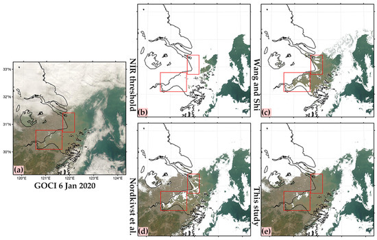 Comparison of four cloud masking methods over coastal water around the mouth of Yangtze River and Hangzhou Bay of China on 6 January 2020. The images of (a–e) are the same as Figure 6. Clouds are indicated as white. The smaller red rectangle (right one) marks the location around the mouth of Yangtze River, and the bigger red rectangle (left one) marks the west part of Hangzhou Bay of China.