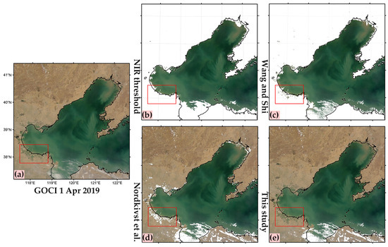 Comparison of four cloud masking methods over Bohai of China at 03:16 (UTC) on 1 April 2019. The images of (a–e) are the same as Figure 6. Clouds are indicated as white. The red rectangle marks a typical region of silt and tidal flats along the coast of Bohai.