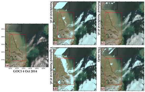 Comparison of four cloud masking methods over water area off the south of the Korean Peninsula at 03:16 (UTC) on 18 April 2019. The images of (a–e) are the same as Figure 6. Clouds are indicated as white. The red rectangle marks the coastal turbid water area around the Korean Peninsula.