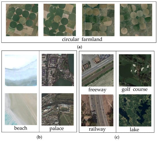 The above-mentioned methods pay attention to training a well-performed classifier or a robust learning model for few-shot learning, which ignores the significance of feature expression. As for scene classification of remote sensing images, the classifier may not perform well when the learned features cannot effectively represent the corresponding category [17]. Furthermore, in the tasks of few-shot remote sensing image scene classification, high similarity of images between categories, and great differences in images within the same category are great issues [18]. Some examples can be found from Figure 1. It is observed from Figure 1a that these images reflect intra-class consistency, which are well-suited to few-shot classification. In Figure 1b, images belonging to the beach category have different colors, and images in the palace category show different textures, which reflects the phenomenon of large intraclass variances. In Figure 1c, it is obvious that images of freeway and railway have similar texture features, and images of lake and golf course have almost consistent backgrounds, which indicates that there are high similarities between categories. Moreover, there may be diverse objects in a remote sensing images, which also influences the performance of scene classification. These issues seriously affect the classification performance, and effective feature representation for remote sensing images should be considered.