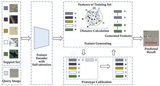 The proposed prototype calibration with the feature-generating model for few-shot remote sensing image scene classification is depicted in Figure 2.