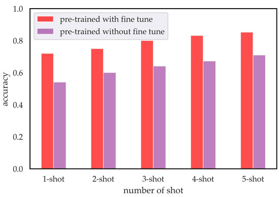 It can be seen from Figure 6 that the accuracy of five-way five-shot is only 70.94% without fine tuning, which is obviously lower than our model by about 14%. Similarly, in the setting of five-way one-shot, accuracy without fine tuning is 54.06%, which is lower than our model about 18%. The proposed model with fine tuning yields higher accuracies in different number of shots. It is verified that fine tuning utilized in our pre-training strategy has a great contribution to improve classification performance, which can train the feature encoder with strong ability to extract features.