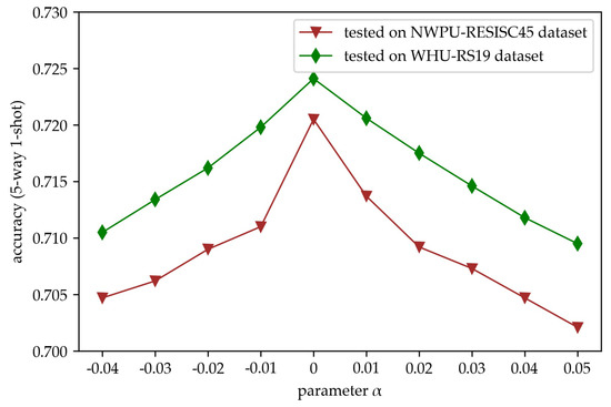 After prototype selecting, mean and covariance of these selected prototypes are calculated as the benchmark for feature generation, where a parameter is utilized in the calculation. In order to analyze the influence of , classification accuracies with the changing of in five-way one-shot case are tested on WHU-RS19 and NWPU-RESISC45 dataset. Curves of classification accuracies changing with the parameter are shown in Figure 8.