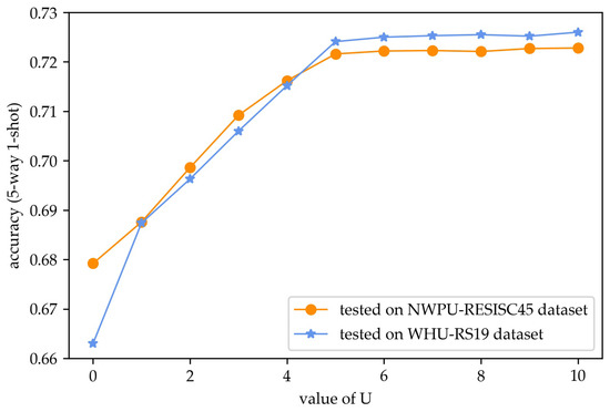 As shown in Figure 9, the accuracy with is the lowest, which demonstrates that the proposed prototype calibration contributes to improving the classification performance. The accuracy increases with the increasing of U, and it tends to be stable when U is larger than 5. It can be concluded that prototype calibration with five selected images from the query set is able to strengthen the expression ability of prototypes, where five images with the highest prediction probabilities are selected. Therefore, during prototype calibration, five selected images from query set are utilized to adjust prototypes, which can not only enhance the few-shot classification accuracy but also rationally use the computing resources.