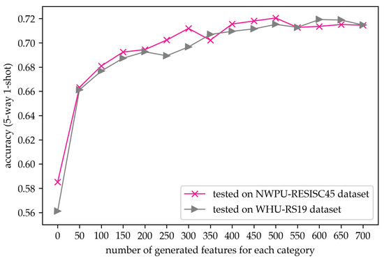 In order to illustrate the effect of feature generation, comparisons with different feature generation strategies are performed in Figure 10. Accuracies with the increasing of generated features are tested in the case of five-way one-shot. When the number of generated features is equal to 0, it can be regarded as the model without feature generation. Furthermore, cases with the number of generated features greater than 0 can be regarded as the model with feature generation.