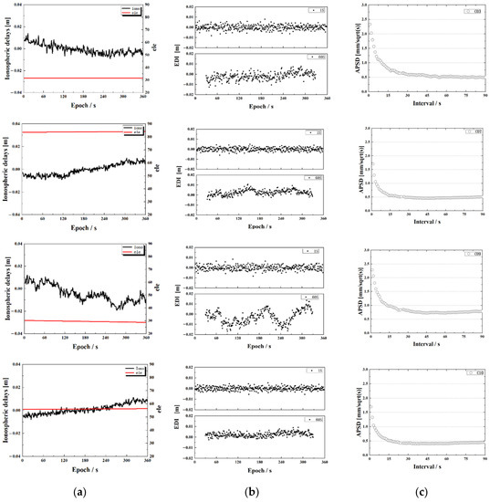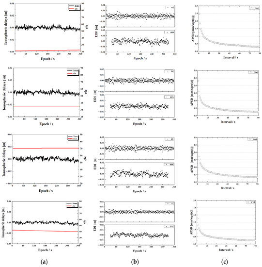 In order to further investigate the characteristics of the ionospheric delay observations, Figure 1 and Figure 2 show the time series of ionospheric delay observations with the elevation angle (left column), the EDI with 1 s and 60 s differential interval (middle column), and the APSDs along with the differential interval (right column) of the four typical satellites for the zero-baseline and the long-range baseline of 202 km, respectively.