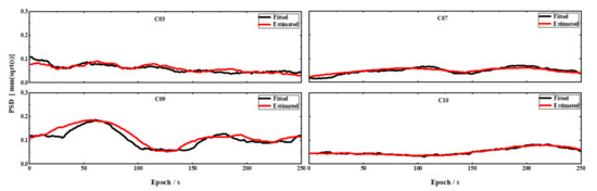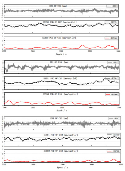 It can be seen from Figure 12 that the EST01 is affected by observation noise and exhibits much larger noise and cannot reflect the trend of the ionosphere delays in comparison with EST60 obtained by moving average approach. For example, the C07 has two large changes around the epochs 2700 and 3400, respectively, which can also be seen from the ionospheric delays time series in Figure 11. The PSD of EST60 is in good agreement with the ionospheric variation and can capture them precisely in real-time operation.