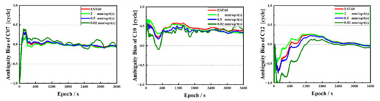 In order to further understand the impact of the different PSDs, the estimated ambiguities of their float solutions are instructed in Figure 7. It can be seen that the estimated ambiguities of the EMP 0.5 show similar behavior to the EST60 with high accuracy from the beginning, while the ambiguities of the EMP with 0.02 approach reach their stable status rather slowly and even with some slow fluctuations.