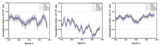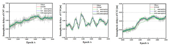 Figure 11 shows the corresponding fluctuation of ionospheric delays for C07, C10 and C12. EST60 estimates agree with the observed values perfectly which are almost in the middle of the observed ones. With the increased PSD of EST60 × 3, the ionospheric delays are close to that of EST60. With the decreased PSD of EST60 ÷ 3, the estimated ionospheric delays are overall underestimated, which are behind the observed values and in general cannot reflect the ionosphere delays variation, especially for sharp fluctuations.