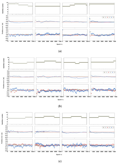 where , are the float solution of the position parameters and the ambiguity parameters. The integer ambiguity resolution is carried out by using the Least-squares AMBiguity Decorrelation Adjustment (LAMBDA) method [35]. Finally, the fixed solutions of the other interested parameters can be obtained by the standard least square adjustment, for example, the fixed solution and the variance-covariance matrix of coordinate parameters, expressed as: