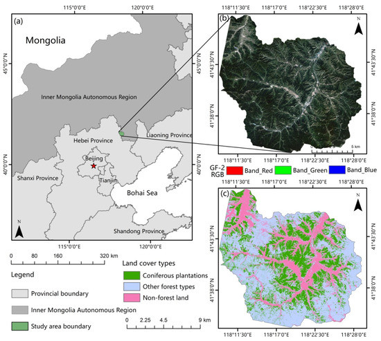 (a) Study area location; (b) GF-2 images of the study area; (c) distribution of coniferous forest, other forest types, and non-forest land in the study area.