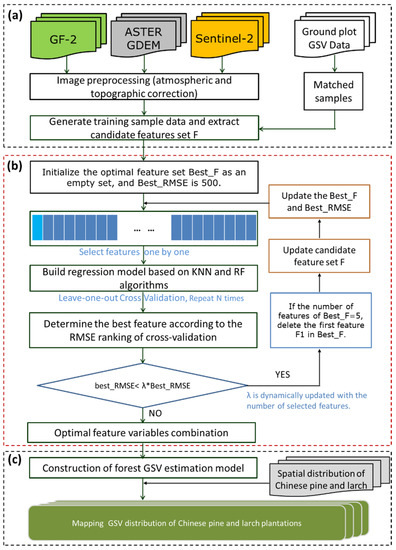 Forests are the largest carbon sinks in terrestrial ecosystems and play a crucial role in the global carbon cycle [1,2]. The forest growing stem volume (GSV) is the total trunk volume of various living standing trees per unit forested area, which reflects the quality of forest resources and health of the forest ecosystem [3,4]. Accurate forest GSV measurement is vital for the dynamic monitoring of regional-scale forest carbon storage [5,6,7]. The traditional GSV measurement method often disturbs the ecological environment and is expensive and laborious [5]. Remote sensing technology has significant advantages, such as wide coverage, low cost, and high efficiency, and has been widely applied in forest GSV estimation [3,4,5,6]. However, owing to the complexity and spatial heterogeneity of forest ecosystems, forest GSV estimation by remote sensing has led to many uncertainties [8,9,10]. During the actual application of remote sensing-based GSV estimation, the remote sensing data sources, selection of feature variables, and estimation models all affect the final estimation accuracy [11,12,13,14,15].