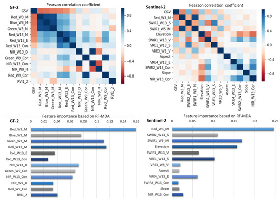 The correlation and importance analysis of the feature variables selected by AFCO-RFR method based on the GF-2 and Sentinel-2 datasets, respectively.