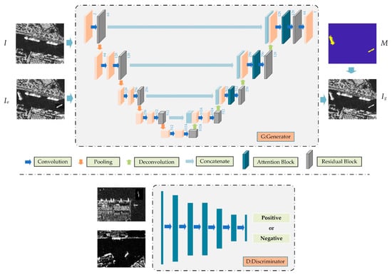 Given a real SAR image , the pre-prepared ship slice images are embedded into so as to obtain the embedded image . To improve the generated results, this paper proposed a two-channel (original SAR image and embedded SAR image) input mechanical. Next, the ship mask M is made, indicating the regions where the embedded ships are located. Mask M is only used in the training stage to help improve the final result. The purpose of the ship sample augmentation method is to train a model that reconstructs to be closed to the real SAR image. To achieve this goal, a GAN framework is utilized. As shown in Figure 2, the method consists of two parts: generator G and discriminator D.