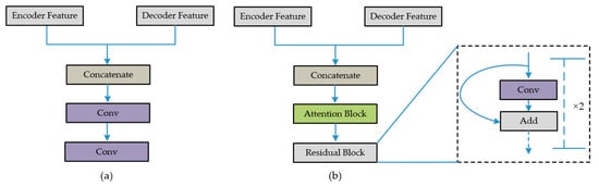 Illustration of the proposed attention module. (a) Original U-Net structure; (b) Proposed network.