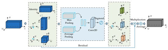Next, the pooled feature is processed through a standard convolution layer and a sigmoid activation layer. After this step, the intermediate output is subsequently rotated through 90° anticlockwise along the W axis to obtain . Similarly, the output of the other two branches are and .