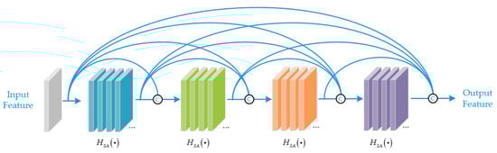 Reusing features in deep networks via dense connection is an effective way to achieve high computational efficiency []. The counter-intuitive effect of the dense connected mode is that it requires fewer parameters than traditional convolutional neural networks as it does not need to relearn redundant features. A densely connected mode can improve the flow of information through the network, which makes training easier. Each layer has a direct path from the loss function and the input information directly to the gradient, which allows for deeper supervision. Furthermore, a dense connection has a regularization effect, which reduces overfitting on smaller training data sets [].