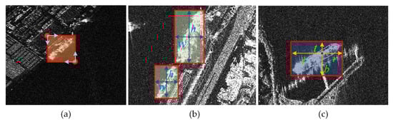 The geometric shape of the ship target is a long ellipse, and the orientation is arbitrary. Therefore, the corresponding bounding boxes undergo a large change (e.g., extreme aspect ratios). Figure 8 shows the typical SAR ship images. The design of the anchors is empirical, which cannot fully describe the shape of ship targets. Although the regression branch can slightly amend the anchor box, the anchor-based framework still has lower flexibility, and ships with a peculiar shape may be lost. Therefore, an anchor-free framework could be more suitable for ship detection.