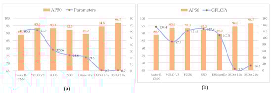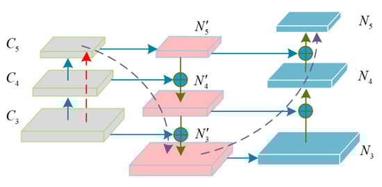 The structure is illustrated in Figure 10, for which DSNet is taken as the backbone of the detector. The output of stages 3–5 are utilized to detect targets. As shown in Figure 1, the output of stages 3–5 in the network is defined as . denotes the feature levels generated by the feature fusion pyramid. The augmented path starts from the lowest level and gradually approaches . From to , the spatial size is gradually down-sampled with a factor of 2.
