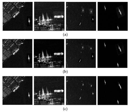 Furthermore, as a data-hungry approach, deep learning demands a large number of training samples to ensure its performance and generalization ability. Compared with optical datasets, the number of samples in SAR datasets is much smaller, which limits the detection performance. Data augmentation is an efficient way to address these issues. Crop, rotation, saturation, bilateral blurring, MixUp, CutMix and Mosaic are the representative conventional data augmentation methods. However, such methods cannot improve the detection performance to a satisfactory extent. Many novel data augmentation methods have been developed to improve the SAR classification performance [,,]. However, similar studies in the field of SAR ship detection have hardly been conducted.