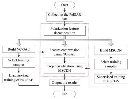 In order to use the multi-temporal PolSAR data to classify crops, a neural network NC-SAE was employed to compress the data, and then a novel crop discrimination network with multi-scale features (MSCDN) was constructed to achieve the crop classification. The flowchart of the whole study method is shown in Figure 1, which mainly includes three steps: polarization feature decomposition, feature compression and crop classification.