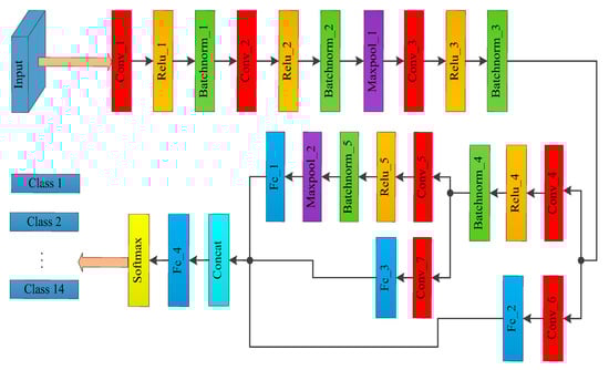 As shown in Figure 3, the MSCDN comprises seven convolutional layers, two max-pooling layers, four fully connected layers, one concat layer, and a softmax classifier. The Rectified Linear Unit (ReLU) and Batch Normalization (BN) layers are successively connected after Conv_1 to Conv_5. The aim of ReLU layer is avoid the problems of gradient explosion and gradient dispersive to further improve the efficient of gradient descent and back propagation. As for the BN layer, it is a normalized procedure for each batchsize of internal data for the purpose of standardizing the output data as the normal distribution with zero mean and unit variance, which can accelerate the convergences. The branches of Conv_6 and Conv_7 aim to reduce the depth of the output feature image from Conv_3 and Conv_4, and decrease the computational complexity. The detailed parameters of the convolution kernel for each layer and other parameters for the MSCDN structure are listed in Table 2.