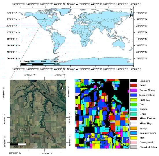An experimental site, which was established by the European Space Agency (ESA), was used to evaluate the performances of the proposed method. The experimental area was an approximate 14 km × 19 km rectangular region located in the town of Indian Head (103°66′87.3″ W, 50°53′18.1″ N) in southeastern Saskatchewan, Canada. This area has 14 classes of different type of crops and an ‘unknown’ class including urban areas, transport corridors and areas of natural vegetation. The number of pixels and total area for each crop type are summarized in Table 3. The location maps from Google Earth and ground truth maps of the study area are shown in Figure 4.