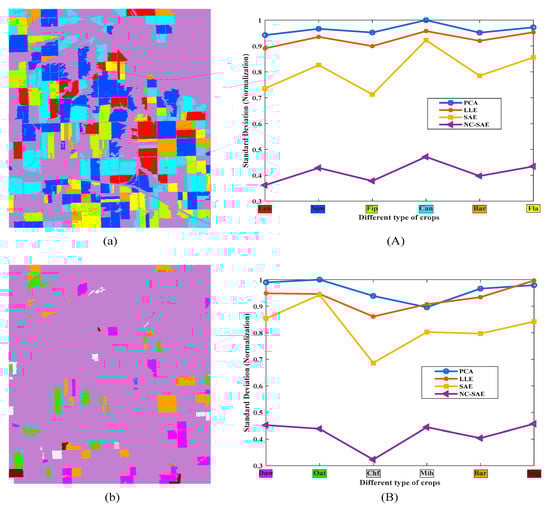 Firstly, for the dimensionality reduction, the reconstruction error curves of SAE and NC-SAE in the training processes are shown in Figure 5. It can be seen that the reconstruction error of NC-SAE is slightly less than that of SAE. Moreover, the standard deviation within the same crop class were calculated and plotted in Figure 6A,B for different categories. The six main crops (i.e., lentil, spring wheat, field pea, canola, barley and flax) which have relatively larger cultivated areas shown in Figure 6a were chosen to evaluate the standard deviation. Meanwhile we also choose six easily confused crops shown in Figure 6b (i.e., durum wheat, oat, chemical fallow, mixed hay, barely, mixed pasture) for performance evaluation. We can see that the standard deviation of the proposed method NC-SAE is the smallest. Therefore, a better crop classification performance is expected by using the features that extracted through NC-SAE.