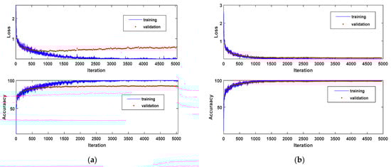 The size of input sample for classifiers also affects the performance for crop classification. After the compression data with NC-SAE, Table 7 gives the classification results of MSCDN classifier with different sample size, the corresponding training curves are shown in Figure 9. Firstly, we set the size of input samples for the MSCDN classifier to 15 × 15. In this scenario, slightly over fitting has been observed when training the MSCDN, which is shown in Figure 9a. This problem has been ultimately solved by increasing the size of input sample. Figure 9b shows the training curve for input samples with size of 35 × 35. We see that the over-fitting can be completely eliminated by expanding the input size. Observing Table 7, we see that the OA and Kappa increased by 4.12% and 4.98%, ultimately rise to 99.33% and 99.19%, respectively, when increasing the input size from 15 × 15 to 35 × 35, whereas when the size of input samples was expanded to 55 × 55, both OA and Kappa only raised approximately 0.3% relative to the 35 × 35, while considerable computational burden is needed. Therefore, a moderate size 35 × 35 for input samples is recommended in real applications.