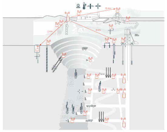 Several methods have been used for slope monitoring and landslide measurements. Terrestrial laser scanning (TLS) and global navigation satellite systems (GNSS) (including global positioning systems (GPS)) are two common techniques used for this purpose [4]. Another one is the synthetic aperture radar interferometry (InSAR) [5,6]. However, land displacements are mostly monitored using a series of sensors disseminated on the ground surface [7]. To detect land motion, or measure its rate, magnitude, and direction, monitoring is conducted using devices such as slope movement sensors (extensometers), accelerometers, inclinometers, tiltmeters, distometers, prisms, survey stations, and vibration sensors [8]. Internet of Things (IoT) monitoring systems are often used for geotechnical information, alone or in combination with innovative technological elements [9,10,11]. Traditional manual reading is being progressively replaced by the deployment of wireless networks of commercially available instruments to collect, transmit, and process land displacement data, as displayed in Figure 1 for a mining environment. Such monitoring networks have several advantages: