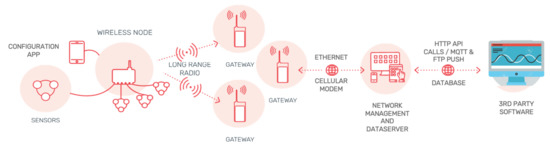 The sensors are wired to the dataloggers wireless nodes. These devices send the information of each sensor to the gateway using the long range (LoRa) radio communication protocol. The information is then relayed over ethernet to the network management and dataserver and can be displayed in a visualization software. The real-time data of the sensors and the network is accessible to the user, and is also used to set alarms and warnings.