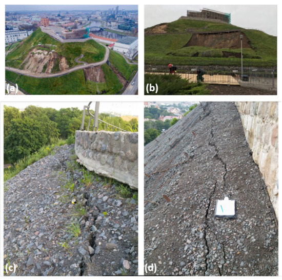 Gediminas Castle was built in the 14th century under the command of the Grand Duke of Lithuania Gediminas. It remains a symbol of the Lithuanian state. However, historical sources recorded many landslides over the years on the erosive Gediminas Castle Hill, which represent a risk for the castle conservation. The remaining structures of the castle stand 40 m high, at 138 m above sea level. Geologically, Lithuania is the bottom of the former sea, consisting of sedimentary rocks. The castle hill is composed of quaternary glacial, glaciolacustrine, glaciofliuvial inter-layered deposits and technogenic (cultural layer) accumulations [33]. The years 2016 and 2017 were marked by very heavy rains and all the hillsides were affected by landslides. The first unprecedented slope failures occurred on the northwest slope in February 2017. New landslides were observed in 2020. The consequences of these events are depicted in Figure 4.