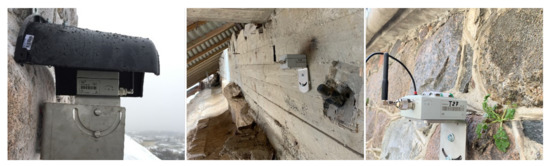 The tiltmeters are installed on the walls of the castle, at the top and at the bottom of the hill, and some installation examples are displayed in Figure 6.