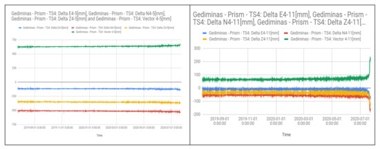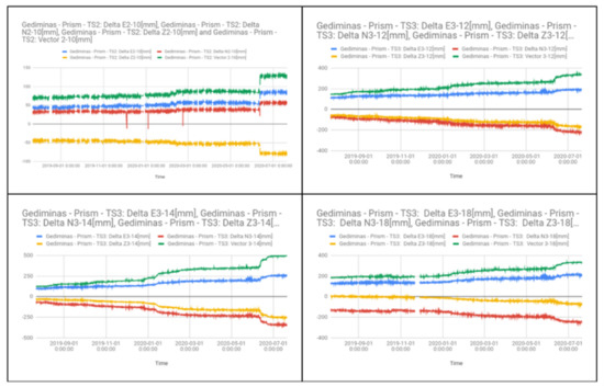 The movement was detected by the prisms highlighted in Figure 13, whose measurements are displayed in Figure 14.