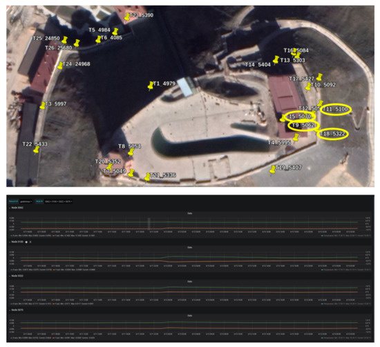 The first recent major slope failure occurred in February 2017 and prompted emergency maintenance works on the hill for slope stabilization, together with installing a digital monitoring system comprising four robotized Geomax Total stations Zoom 900, serving 50 geotechnical prisms in the hill soil, and 28 Loadsensing bi-axial tiltmeters on buildings and defensive and protective ramparts. Measurements are performed every 30 min. The data are sent to a gateway and eventually translated into Vista Data Vision cloud visualization software. The monitoring program also included the installation of total stations and monitoring prisms. During the observation period (2016–2020), the number of sensors was periodically increased, and their location amended, the final location being illustrated in Figure 5. In 2019, the soil reinforcement works were completed; however, the monitoring equipment was left for post-reconstruction monitoring. The InSAR ascending and descending orbits data from Sentinel-1 were analyzed from January 2019 to October 2020 to complete the survey, and the correlation between all three data sets was studied.