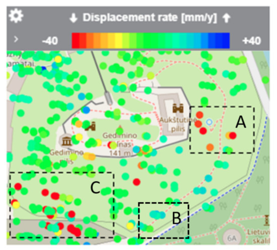 In Figure 10, the linear displacement rates of several point scatterers on the slope of the castle hill are presented. SkyGeo’s InSAR algorithm has captured several point scatterers that show a large linear rate of displacement (in red) from January to June 2020. The labels indicate the areas of the failures in June (Areas A and B) and July (Area C).