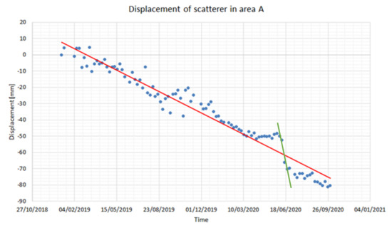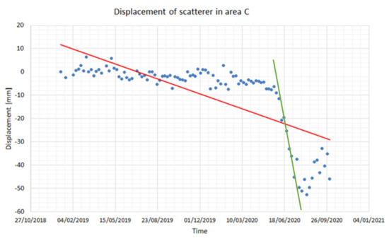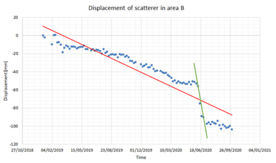 A similar result is observed in Figure 12 from another point scatterer situated on the same face of the hill, scatterer B. Here, the gradual displacement from the beginning of 2019 is even more apparent. It also clearly depicts the increased rate of acceleration around December 2019, six months prior to the June 2020 event.