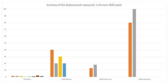 The tiltmeters did not detect the July event, as reported in Table 5, even in the ROI, which demonstrates that, although the hill slopes have experienced a slope failure event, the castle itself was not affected. This illustrates the fact that the displacement of the surrounding area does not always pose a threat to the structure and infrastructure being monitored. Nevertheless, the long-term shift detected by InSAR is also a precursor of future slope failure events.