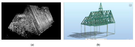 Example of using TLS data: (a) point cloud of a wooden roof truss; (b) conversion to a geometric numerical model.