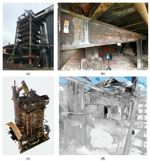 Steel structure of the blast furnace in Starachowice: (a) location of the analyzed beam; (b) view of the test site; (c) point cloud of the whole structure; (d) clipped point cloud of the analyzed beam.