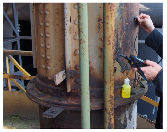 In order to verify the obtained results of the analysis, additional in situ tests of the corrosion progression were performed using an ultrasonic thickness gauge SONATEST type T-GAGE V DLW equipped with a DK-537 head (Figure 4). According to the test procedure, the device was calibrated on a VW-ML calibration tile. The result of the test was the actual thickness of the profile wall. The coupling medium included in the kit was used, and the test surface itself was prepared by grinding off the existing corrosion products. Ultrasonic measurement of the thickness of the walls of the tested steel element was carried out using the echo method. Standard PN-EN-14127 “Non-destructive testing—Ultrasonic thickness measurements” [26] was adopted as the basic procedure. For the assessment of corrosion by this method building documentation is needed. By comparing the measured profile thickness with the profile producer′s data, the degree of corrosion was obtained.