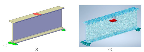 Models of the analyzed beam: (a) 3D CAD model; (b) 3D FEM model.