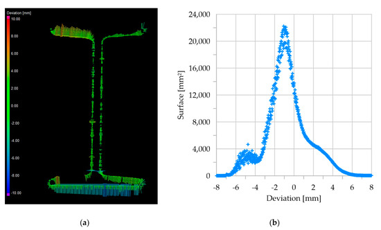 The geometric representation of the analyzed beam based on TLS data differs from the prepared 3D CAD model. In the analyzed beam section, especially in the lower and upper flanges, differences on the level of 6.0–8.0 mm were obtained in relation to the CAD model. On the web itself, smaller differences at the level of 1.0 mm were obtained. Globally, the greatest number of triangular elements generated describing the surface of the tested beam are located inside the compared CAD model, which is illustrated by the largest sum of triangular element areas in Figure 7b. Therefore, it can be concluded that the obtained deviation of −1.0 mm is a measure of the average level of corrosion. The irregularity of the graph at a deviation level of 2.0 mm can be interpreted as a summed increase in deviation due to local corrosion effects in the form of spalling. However, it should be emphasized that the significant increase in deviation at −5.0 mm in the analyzed case can be interpreted by an incorrect registration of individual scans. The deviation results obtained from the analysis performed on the TLS data are consistent with the ultrasonic thickness tests performed on the component. The average thickness change of the web was 6.53%, and that of the flanges was 11.94%. It should be noted that the thickness change was 1.0 mm for the web and −2.5 mm for the flanges. Therefore, taking into account the share of individual surfaces of the web and flanges in the total surface of the tested beam, the obtained deviation of nominal grid at the level of –1.0 mm as a measure of the average level of corrosion is consistent with the results of in situ tests.