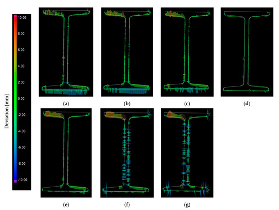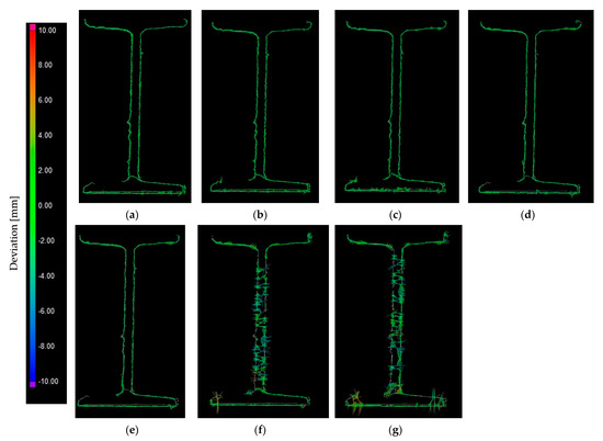 Results of comparing reduced meshes to a 3D CAD model in a selected section: (a) 1.0 mm; (b) 2.5 mm; (c) 5.0 mm; (d) 7.5 mm; (e) 10.0 mm; (f) 12.5 mm; (g) 15.0 mm.