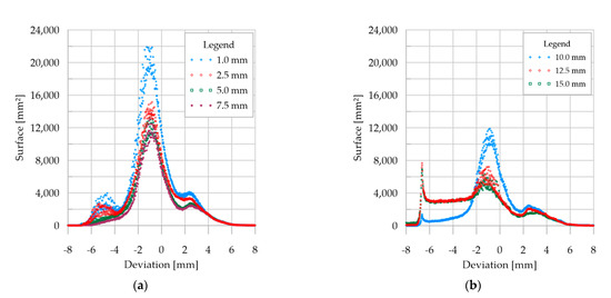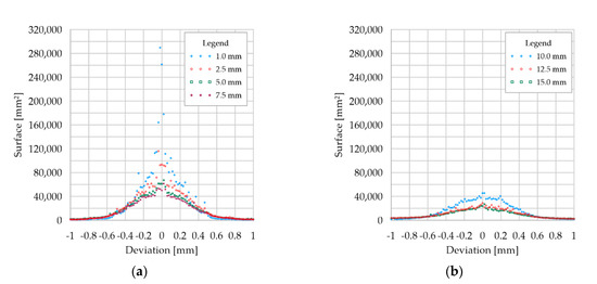 Distribution of deviations of the sum of the areas of the triangular elements for the whole analyzed beam at mesh reduction compared to the CAD model: (a) 1–7.5 mm; (b) 10–15 mm.