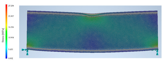 In the case of the second beam, the geometry of which was described by a processed point cloud, the stresses ranged from nearly 0 to 24.5 MPa (Figure 13). In this case, the concentration also occurred at the location of support and force application. As expected, a higher web stress was obtained, the thickness of which was slightly smaller than that of the CAD model because of corrosion processes.