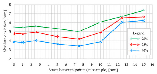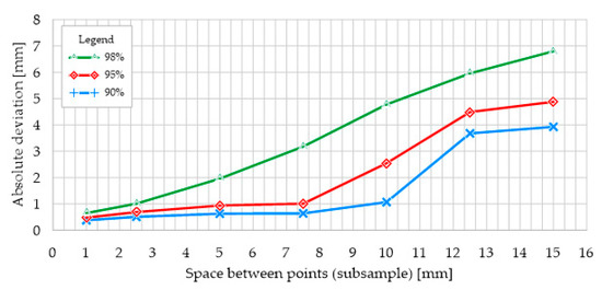 In the case of comparative analysis of meshes based on reduced point cloud for 90% and 95% of all triangular element surfaces, reduction in the range of 1.0–7.5 mm gave similar results to the nominal mesh (Figure 15). For this range of reduction, 95% of all triangular surfaces are within 1.0 mm of the nominal mesh surface. Similarly to the comparison of the reduced mesh with the 3D CAD model, further reduction in the point cloud results in lower accuracy. It should be noted that each successive point cloud reduction for nearly 5% of all triangular element surfaces resulted in an almost linear decrease in accuracy.