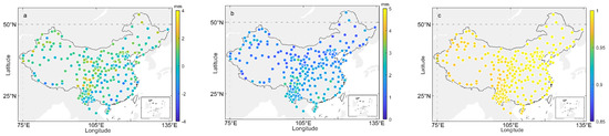 (a) Bias, (b) RMS, and (c) correlation coefficient between GNSS-PWV and calibrated MOD-NIR-PWV in the six-year period studied over each site of the 221 GNSS stations.