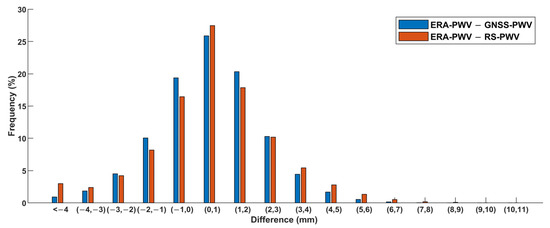Figure 4 shows the distribution, represented by the frequency (in percentage) of data falling into each of the predefined ranges, of the differences between two of the three sets of PWV over the same six-year period. It is noted that GNSS-PWV and RS-PWV are based on single-point results, while ERA-PWV is based on the entire gridded points. The total frequency accumulated in the first five ranges, which are negative data, was 37% for the difference between GNSS-PWV and ERA-PWV, and about 86% of the differences concentrate in the range from −2 to 3 mm. The distribution means a slight overestimation of ERA-PWV. A normal distribution shown by all the blue bars implies that the discrepancies between the two sets of PWV were not systematic biases, which also means a good agreement between the two sets of PWV.