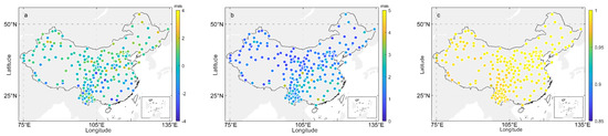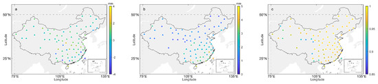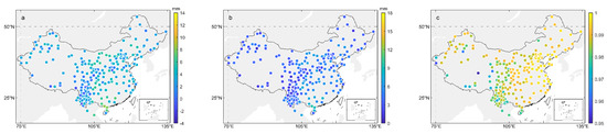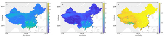 As shown in Figure 8a, the most positive bias values mean the general overestimation of the MOD-NIR-PWV in comparison with the ERA-PWV. The biases were mostly in the range from −0.6 to 8.2 mm with a mean value of 2.1 mm. Most RMS values (see Figure 8b) were in the range from 0.7 to 10.0 mm with a mean value of 3.0 mm. It is clear that poor results were from the regions under a relatively humid climate condition, such as mid-latitude and southeastern coastal regions, especially in Hainan Province, the island in southeastern China where the maximum biases and RMSs were above 7 and 9 mm, respectively. Moreover, both biases and RMSs had similar variation trends: they increased with increasing amounts of PWV from the southeastern coastal region to the northwestern inland region. The overall correlation coefficient values in Figure 8c varied largely, from 0.616 to 0.998 with a mean of 0.975, which was different from the comparison with GNSS-PWV discussed in the above section. In contrast to the high variation in biases and RMSs, the correlation coefficient values showed slight variation in most regions, but abnormally low values (<0.8) occurred on some grid points in the Tibetan Plateau and southwestern region.